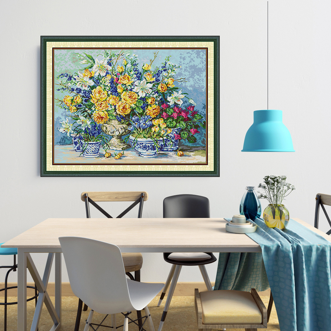 The cross stitch kit does NOT include the picture frame or any other items for display.